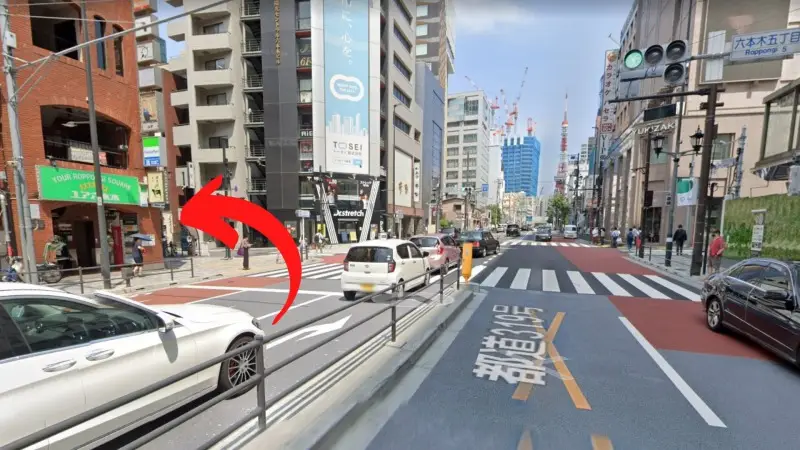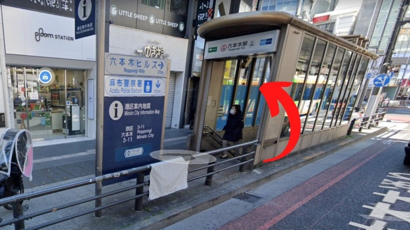 バックドア六本木まではまず、六本木駅から地上に上がります。H04の出口から出ると近いですよ。出たら、矢印の方向に曲がります。