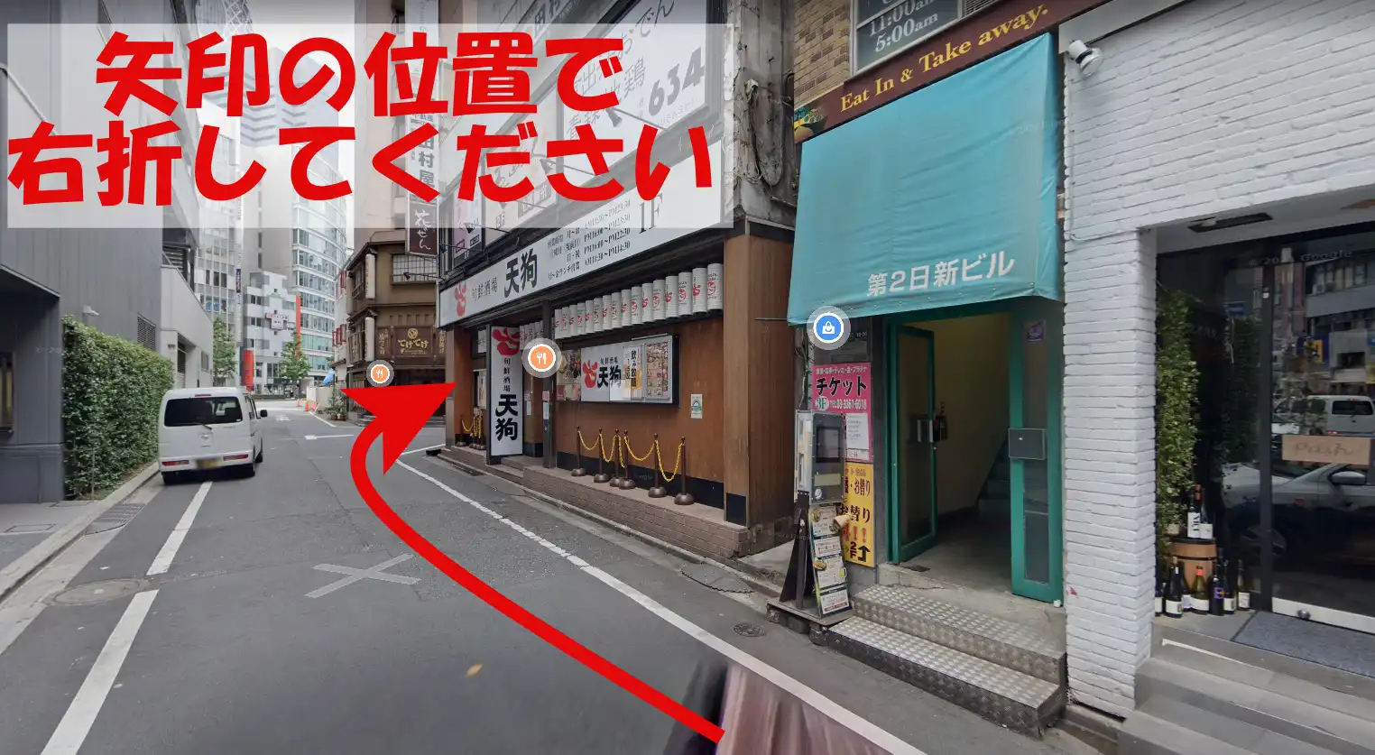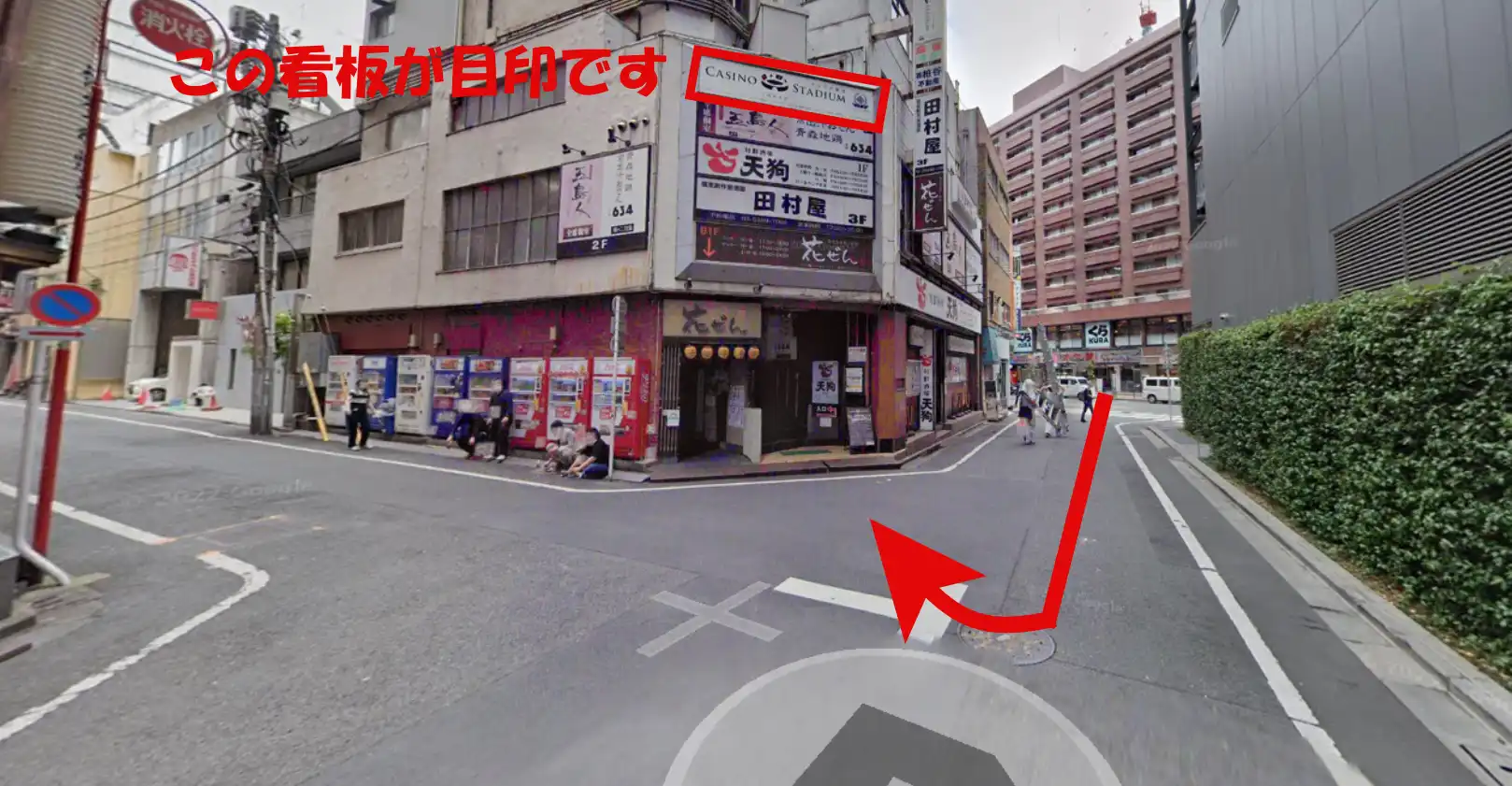 右折すると以下のような位置に出ます。この建物の4階がカジスタ東京になります。看板が出ているため、それを目印にしましょう。