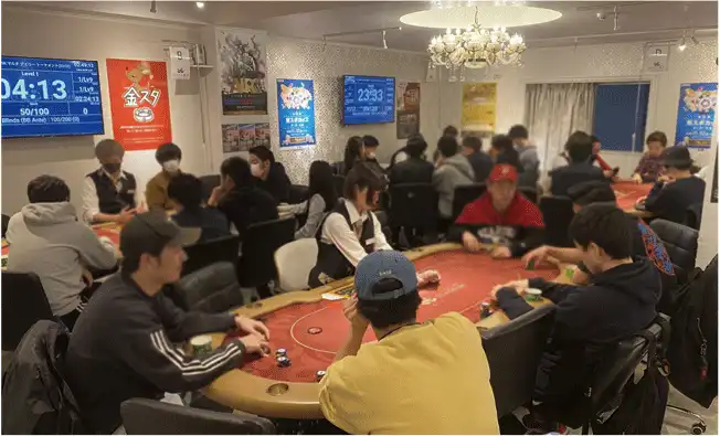 これは実店舗型のアミューズメントでは非常に珍しい特徴です。基本的にフリーロールが行われており、毎日約100名のプレイヤーがポーカーをプレイしています。