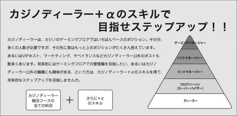 このコースではカジノディーラーの技能を身につけたうえで、スーパーバイザーに必要な知識を学びます。