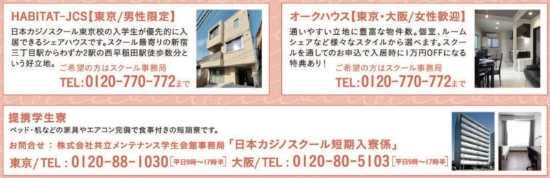日本カジノスクールでは東京・大阪に提携シェアハウスがあるので、安心して通うことが出来ます。