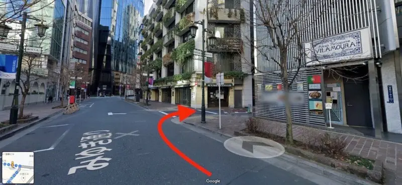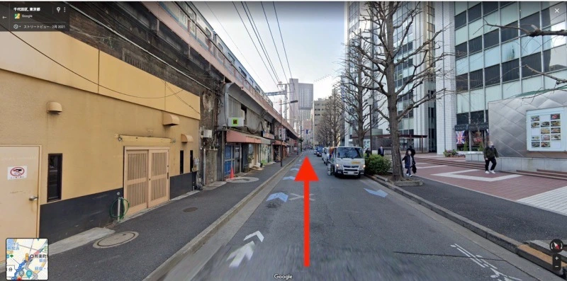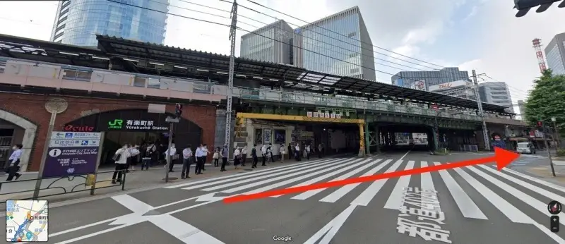 今回は有楽町駅を起点に説明していきます。銀座口を出て線路に沿って進みます。横断歩道を渡ってください。