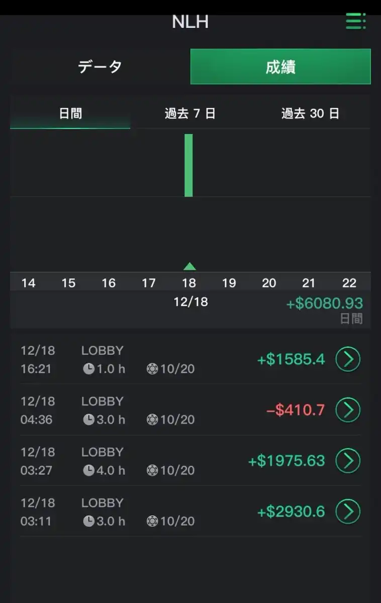 これは、1日で$6,080(83万円)を獲得した際のゲーム成績です。