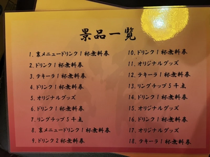 国分寺我龍ポーカースタジアムの四つ目の魅力は、お得なクーポンや景品が当たるルーレットが楽しめるという点です。ルーレットは、500円・1,000円・3,000円の三種類あります。500円のルーレットは以下のような景品になっています。