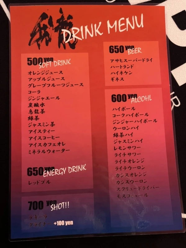 ドリンクメニューの料金は以下の通りです。なお、フードは無料で持ち込み可能です。またUber eatsなどの出前もとることが可能です。