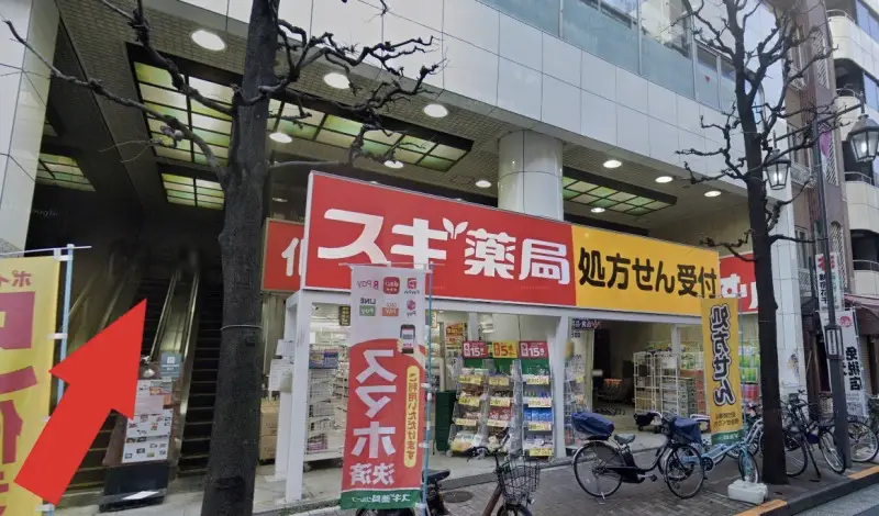しばらく歩くとスギ薬局があるので、そちらを目印に左横にあるエスカレータで上に上がります。