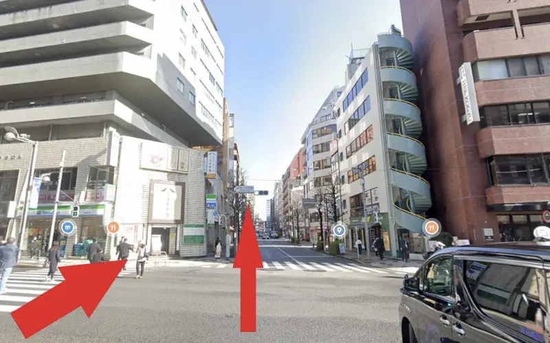 こちらの交差点を渡って直進します。5分ほど歩きます。