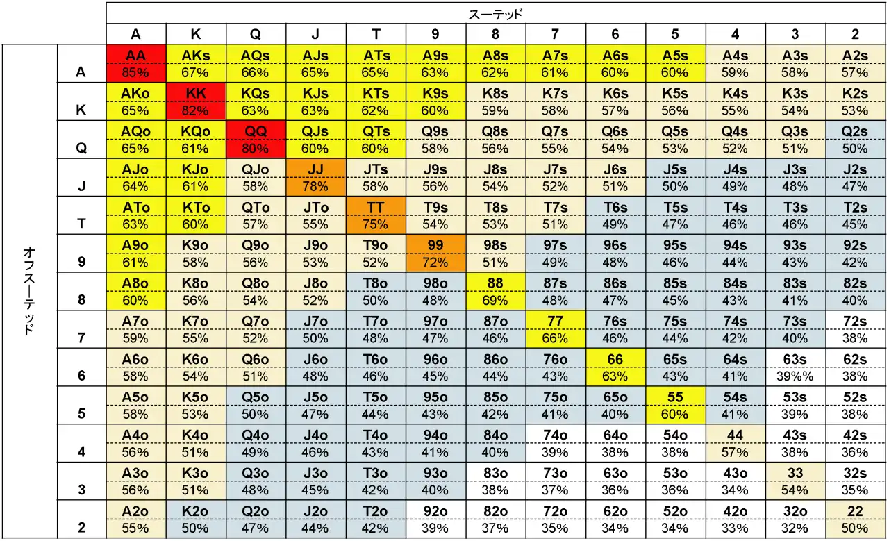 この章ではその数少ないチャンスをものにするためにスターティングハンド時の勝率を%ごとに色分けで紹介したり、自分のハンドと相手のハンドとでどれくらいの勝率の差があるのかを紹介していきます。