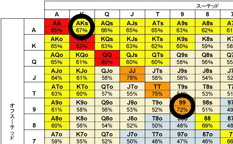 確かにAKのスーテッドは強いハンドですが、それ以上に9や8のポケットを持っているときの方がプリフロップ時点では勝率が高いというのはメンタル的にも安心できると思います。