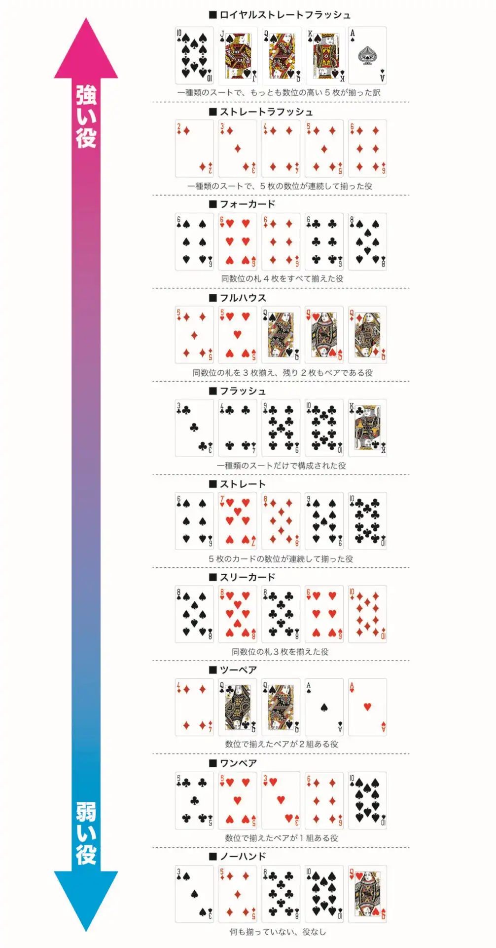 ポーカーの役の強さ順を理解していないとどちらが勝っているか分からずポーカーの楽しみが半減するので絶対覚えるようにしましょう。全ての役とカードの強さを画像にまとめたので保存して用語チェックに使ってください。