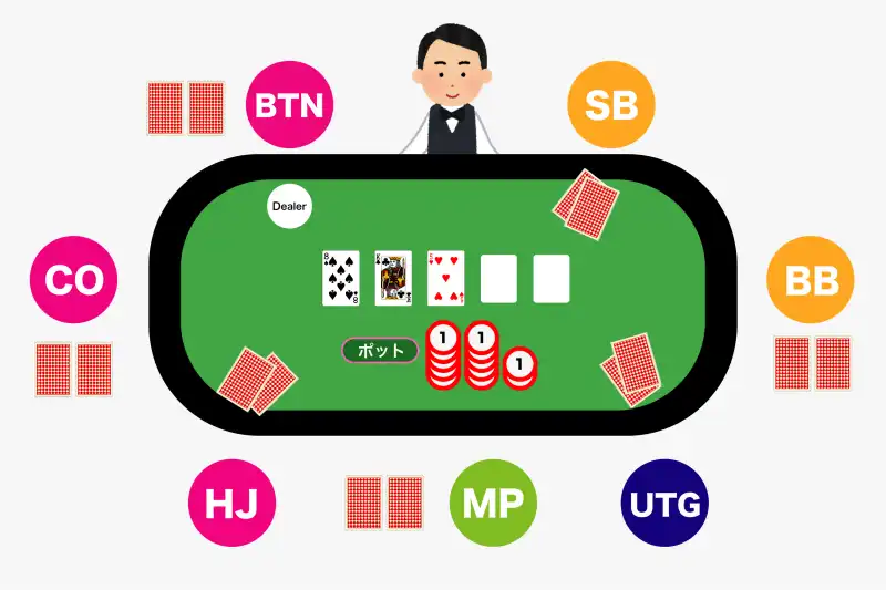 フロップとは場の3枚のカードがオープンされる状態で、SBポジションから始まります。この場合だと4名がフロップまでゲームを続けている状況です。