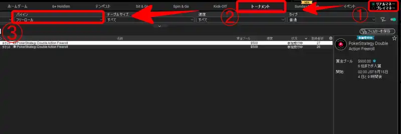 フリーロールに参加する場所は「リアルマネー」であることを確認したら「トーナメント」を開き、「バイイン」の部分をフリーロールを選択すれば無料で参加できるトーナメントが一覧に出てきます。(下の手順を参考にしてください)