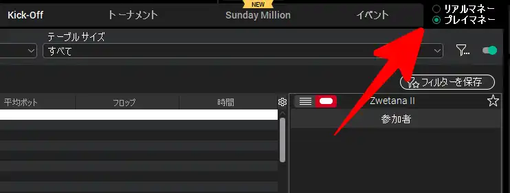 ポーカースターズ(PokerStars)を無料でプレイするには「リアルマネー」から「プレイマネー」への切り替えが必要です。アプリの右上にプレイマネーの表示があるので切り替えましょう。