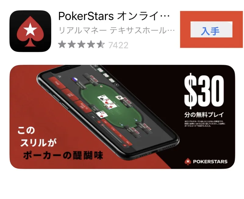 MacならApp Storeを、WindowsならGooglePlayを開きます。「ポーカースターズ」で調べて「入手」を押します。